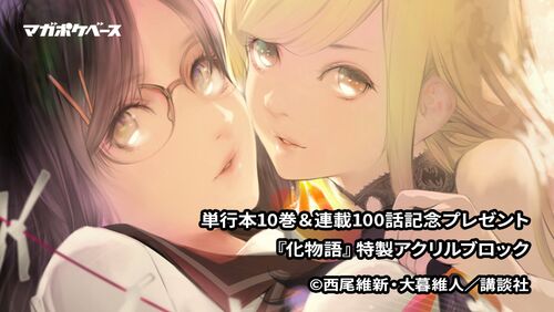 『化物語』単行本10巻到達!&連載100話目前記念!!特製アクリルブロック5種を10名様ずつ50名様にプレゼント!! 5種の絵柄はこれだ!! A:週刊少年マガジン27号の表紙イラスト(羽川&キスショット) B:週刊少年マガジン36・37合併号の巻頭カラー(戦場ヶ原&羽…