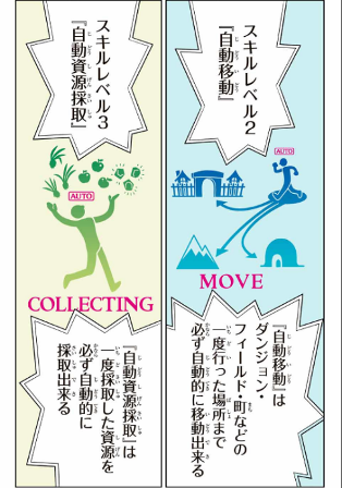 スキルレベル2『自動移動』は、ダンジョンやフィールド、町など、一度行ったことのある場所まで必ず自動的に移動できる能力。
