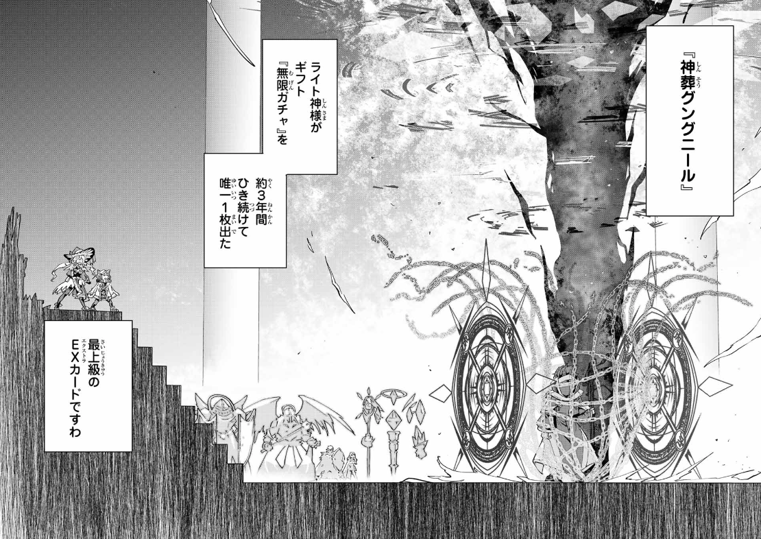 ライトが持つ恩恵(ギフト)『無限ガチャ』とは、使用回数無限のガチャ。周囲の魔力濃度によって、出現するカードのレベルが変わります。